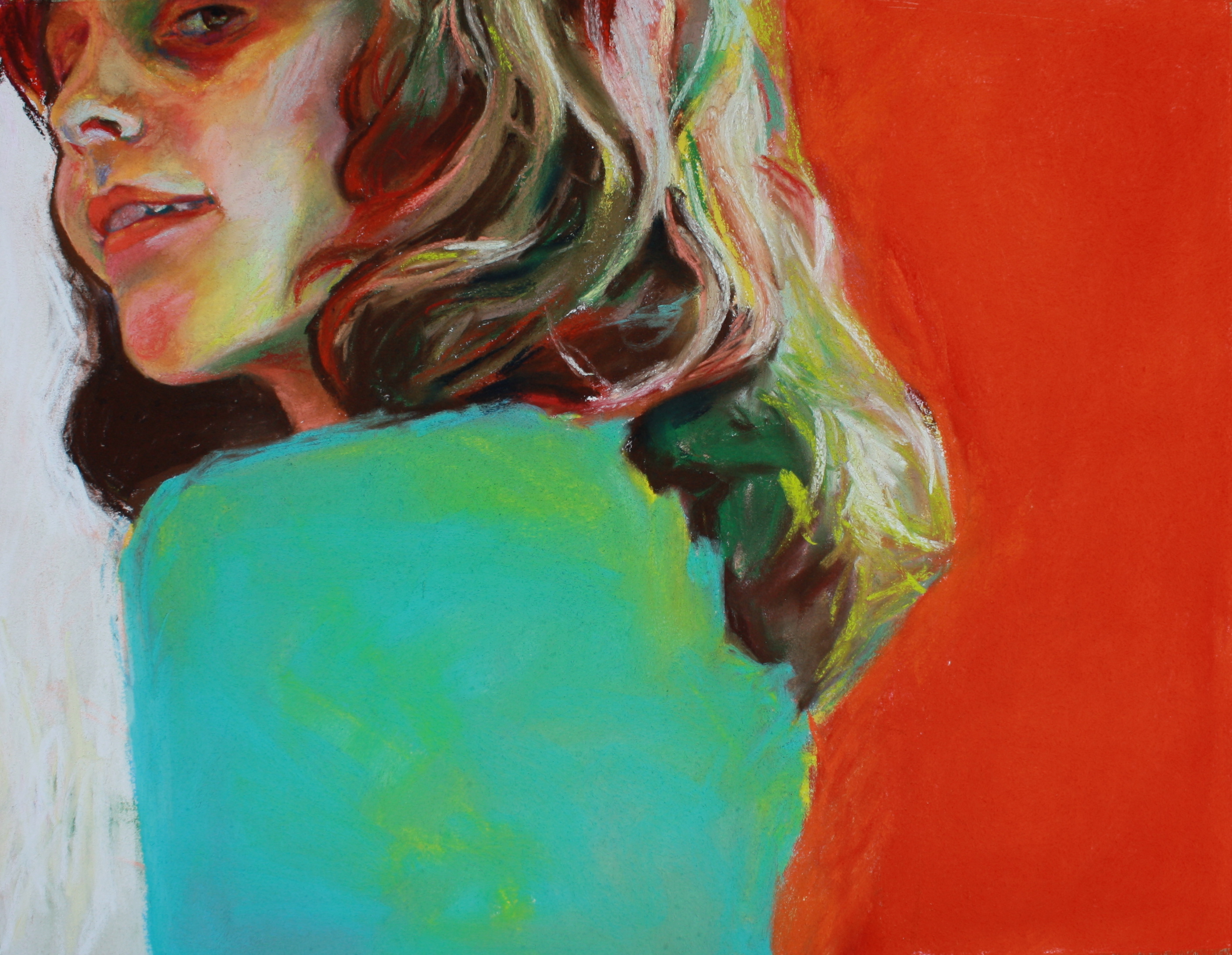Sassy girl peering. Pastel on paper.