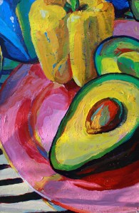 Avocado and pepper on a plate on some stripes.