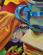 Mug on a book on a floral dress with some fabric and a weird birdhouse.